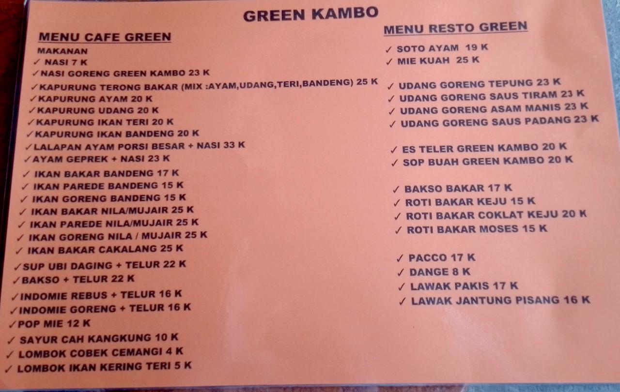 Green Kambo merupakan salah satu tempat wisata kuliner yang berada di kawasan Kambo, Kecamatan Mungkajang, Kota Palopo. Tempat ini dikenal sebagai lokasi yang cocok untuk bersantai karena menawarkan pemandangan alam dari ketinggian yang indah. Dari area tempat duduk, pengunjung dapat menikmati panorama Kota Palopo yang terlihat jelas, terutama pada malam hari ketika lampu-lampu kota mulai menyala. Green Kambo memiliki suasana yang sejuk dan nyaman karena berada di daerah perbukitan dengan udara yang masih segar. Tempat ini sering menjadi pilihan bagi masyarakat maupun wisatawan yang ingin menikmati waktu santai sambil menikmati makanan dan minuman bersama keluarga atau teman.